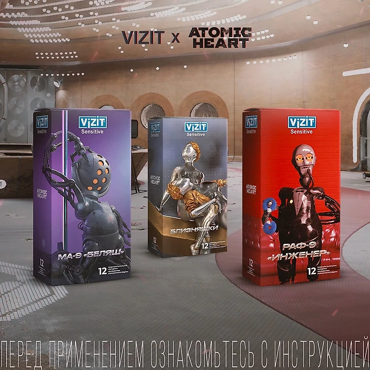 После выхода Atomic Heart производитель презервативов «Vizit» анонсировал специальную линейку средств для предохранения в стиле футуристичного коммунизма под названием «VIZIT Hi-Tech Sensitive». Дизайн первой упаковки вдохновлен роботами-близняшками по имени Левая и Правая, еще две упаковки посвящены роботам Рафику и Беляшу.