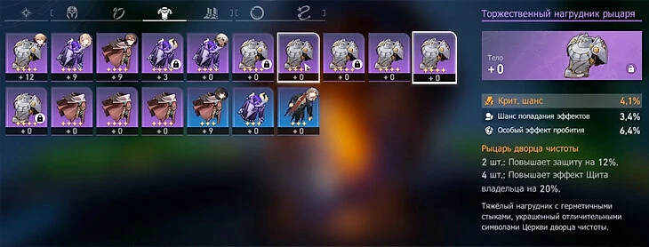Рыцарь дворца чистоты. 2 части: +12% к защите. 4 части: увеличивает поглощение щита на 20%. Подойдет персонажам Сохранения и огненному ГГ.
