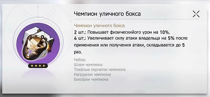 Чемпион уличного бокса. 2 части: +10% к физ. урону. 4 части: +5% к силе атаки за совершенную атаку или получение урона, стакается до 5 раз. Подойдет физическим дамагерам вроде Клары или Сушан.