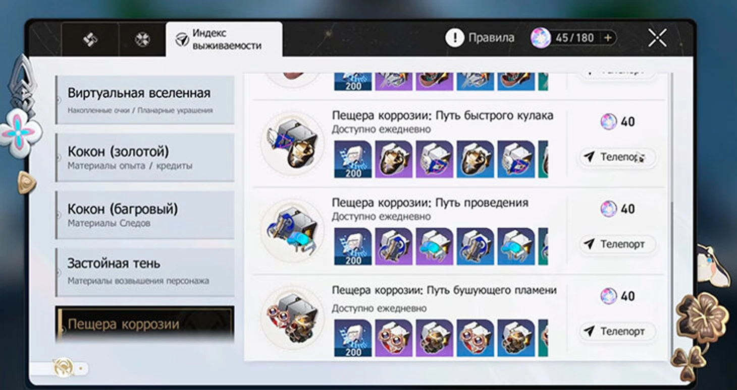 После прохождения сюжетных миссий откроется пещера коррозии, где будут представлены сеты артефактов на выбор и телепорты к ним – по сути это каталог всех имеющихся в игре реликвий. Они разделена на уровни сложности: за первый уровень вы получите 1 эпическую фиолетовую реликвию (⭐⭐⭐⭐), остальные будут синими редкими (⭐⭐⭐) и зелеными обычными (⭐⭐). На втором уровне вы можете выбить несколько эпических, а также редкие и обычные, а на третьем уровне дается две оранжевых легендарных (⭐⭐⭐⭐⭐), две эпических и остальные реликвии. Стоимость выбивания – 40 энергии.