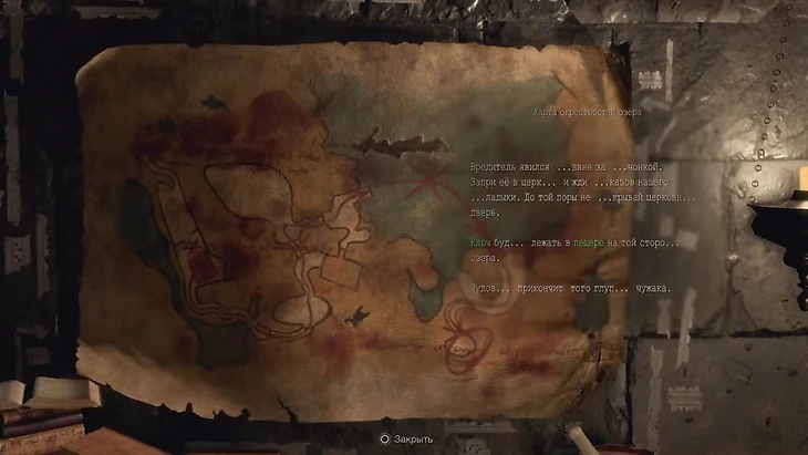 Откройте вход на территорию церкви ключом с символом. В помещении соберите ресурсы и убейте прячущуюся в ящике гадюку – она нужна торговцу, который стоит за следующей дверью. А еще взгляните на потолок: там фонарь с синим драгоценным камнем, сбейте его выстрелом. И осмотрите стол, где лежат файл об истории культа и спрей.