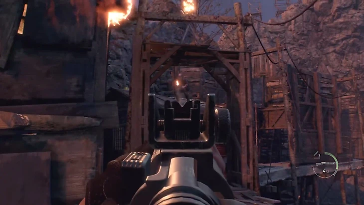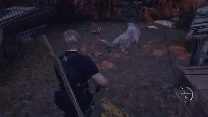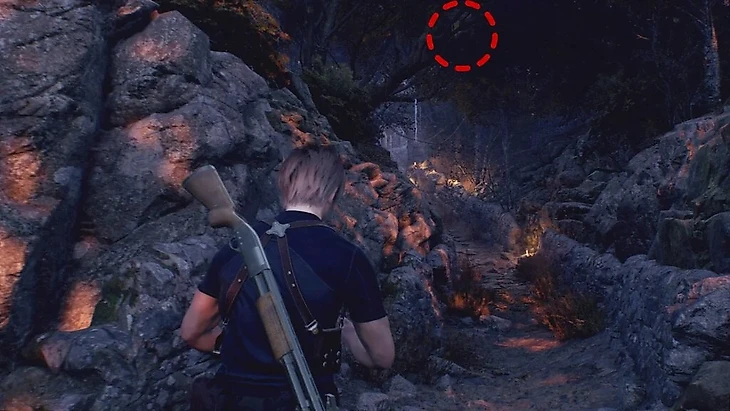 Вернитесь в помещение с картой и спуститесь в подвал. Вскоре Леон выйдет на тропу и сразится с крестьянами. Первый же враг бросает в героя коктейли Молотова – поскорее с ним разберитесь.