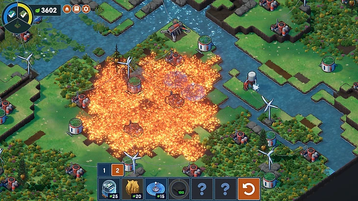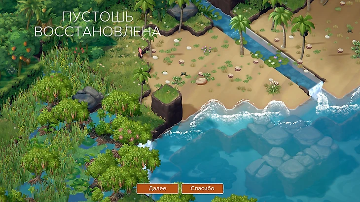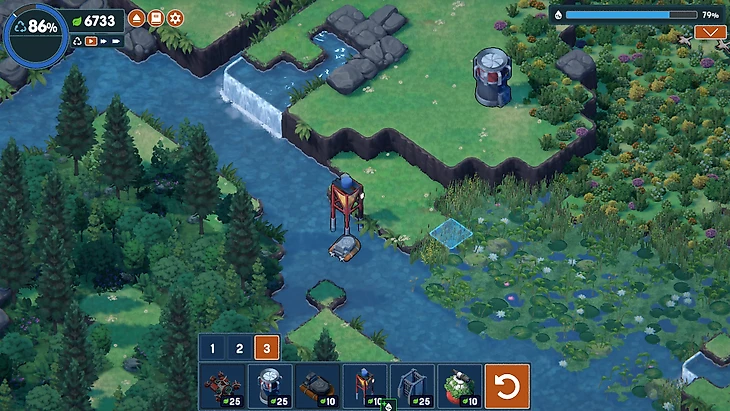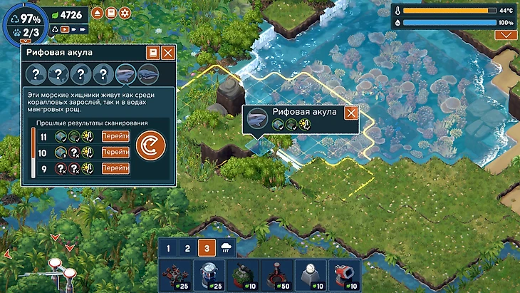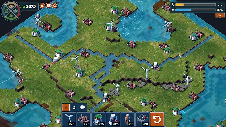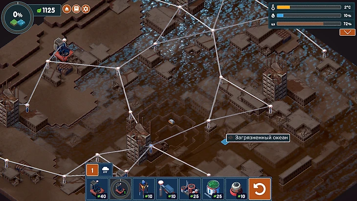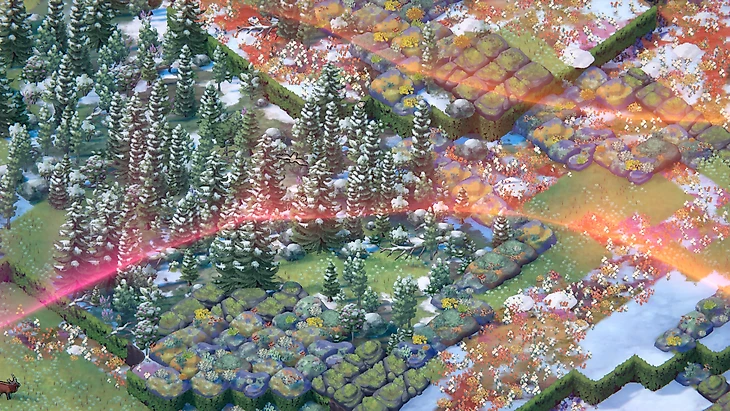 В первые минуты игра показалась мне очень простой, но скоро я открыл парочку сюрпризов: климатические цели и «реверсивное» строительство. На втором этапе игрок восстанавливает экосистемы и следит за климатическими условиями. Растения требуют разную влажность и температуру, а дополнительные цели усложняют задачу. Некоторые из них все равно нужно открыть: дождь и снег «лечат» безжизненные клетки, которые вы не обработали самостоятельно. Игра превращается в интригующий пазл.