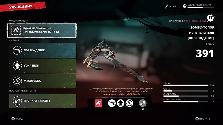 Модификации добавляют урон от стихий (огонь, яд, электричество) и накладывают эффекты вроде кровотечения. Умения повышают прочность, урон, усиливают удары по конечностям. Постоянные умения улучшают характеристики, но в отличие от других улучшений их нельзя заменить.