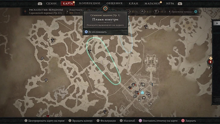 Места выполнения сезонных заданий помечены на карте бирюзовым цветом.