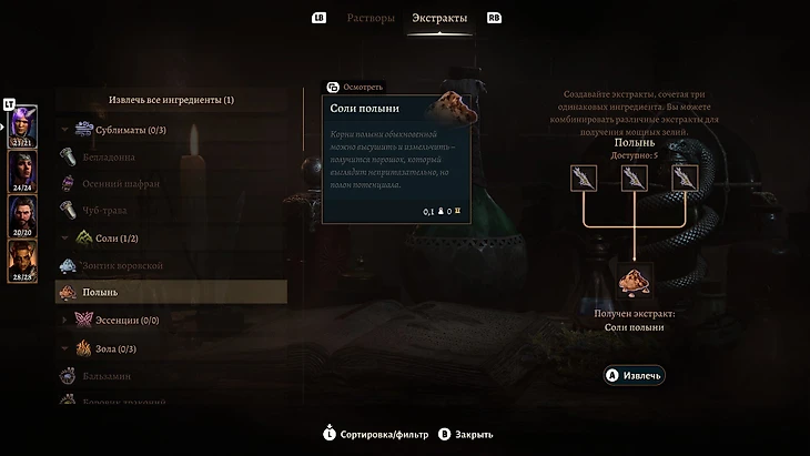 …и откройте «Экстракты». Здесь вы превратите собранное добро в соли, эссенцию, золу и другие ингредиенты для зелий. Для каждого действия нужны 3 материала: например, из трех лакулитов вы изготовите суспензию.
