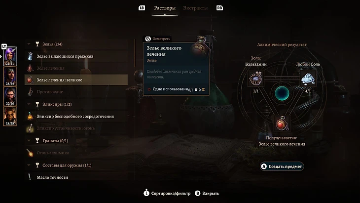Перейдите в раздел «Растворы». Здесь вы приготовите из ингредиентов зелья лечения, эликсиры устойчивости к стихиям, масла поджога и другие полезные расходники.