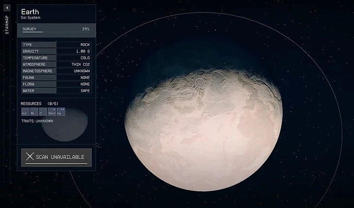 В мире Starfield колыбель человечества превратилась в безжизненный гигантский камень. На Земле нет какой-либо жизни, городов, даже водоемов, остались лишь очертания бывших континентов.