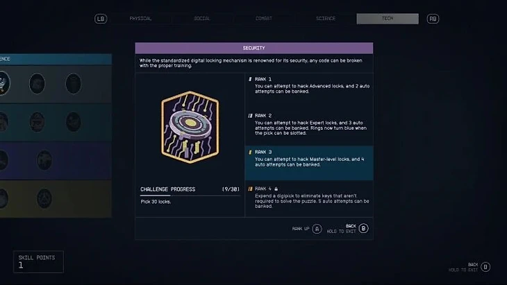 Герой сразу умеет взламывать простые замки, но для продвинутых нужен навык Security из категории Tech. Чтобы развить способность, подбирайте много отмычек и тратьте очки прокачки.