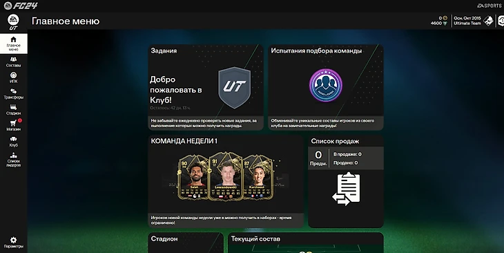 Веб-приложение повторяет функционал Ultimate Team FC 24. Первые шаги стандартные: выберите страну базовых игроков, форму и эмблему клуба. Потом вы попадете в главное меню.