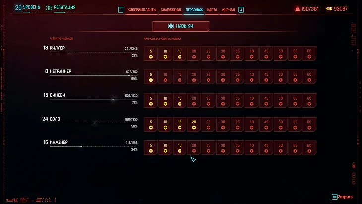 Старые навыки перераспределили по пяти веткам: киллер, синоби, соло, инженер и нетраннер. Уровень в каждой растет быстрее или медленнее в зависимости от вашего метода прохождения. Каждые пять уровней (максимальный – 60-й) награждают пассивными перками вроде дополнительной скрытности для киллера, очков памяти для нетраннера, бонусного урона от гранат и электромагнитного оружия для инженера.