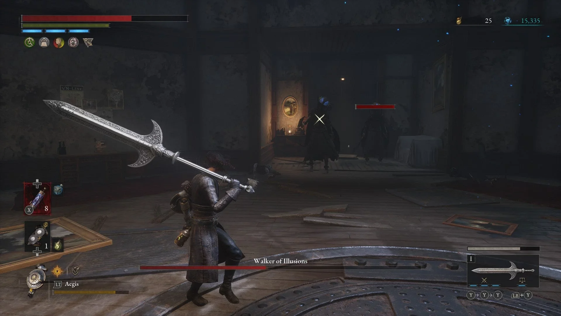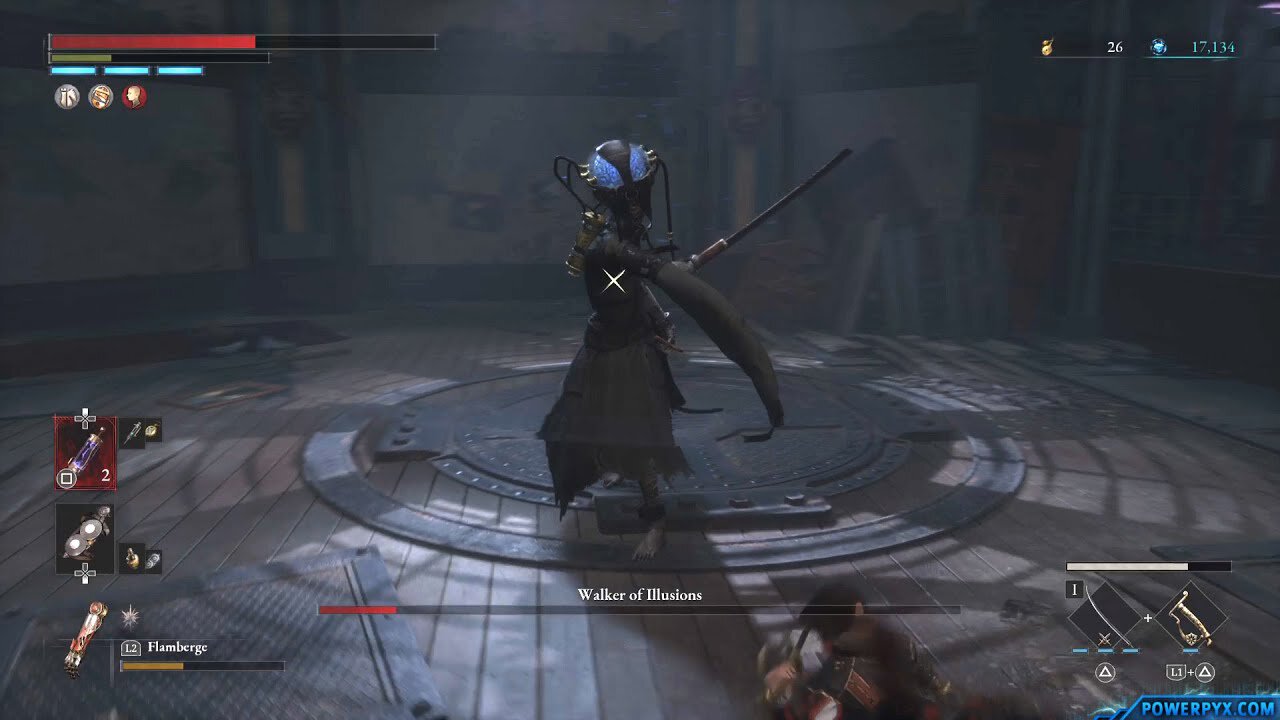 Бой с Проводником Иллюзий (Walker of Illusions) можно разделить на две фазы. В первой, вам нужно держаться на близком расстоянии от босса и уворачиваться от средних и близких атак босса и наносить удары. Держаться на расстоянии от Проводника – не лучшая идея, у него есть несколько атак в рывке, которые сложно доджить.