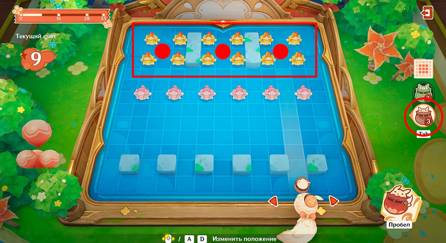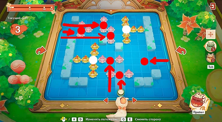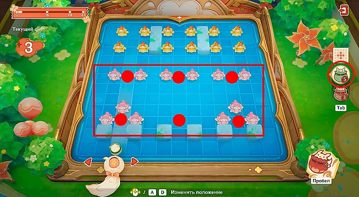 На второй день дадут возможность перемещать Додоко по бокам. Взорвите тремя обычными бомбами нижний ряд, переключитесь на оранжевую бомбу и взорвите оранжевых рыб. Повторите аналогичные действия с верхней частью, там даже проще – не нужно переключаться между рядами. Красным отмечены точки взрыва зеленых бомб, белым отмечены точки взрыва мощных оранжевых бомб.