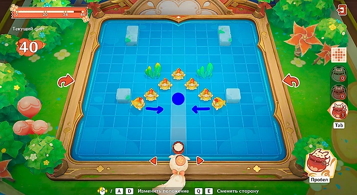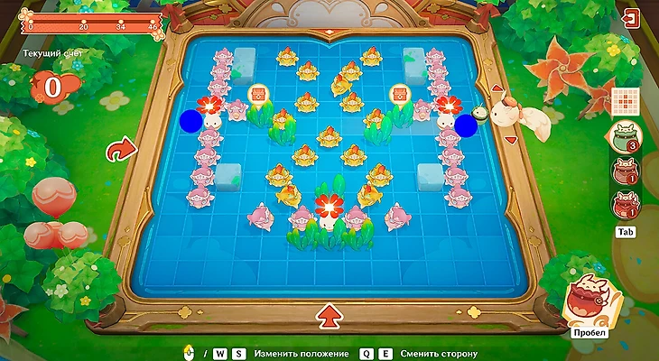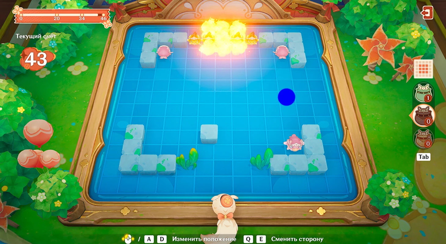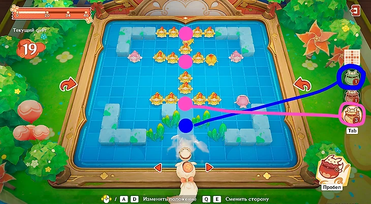 Нужно дождаться, пока рыба на внешней линии отплывет, а две других подойдут. Возьмите квадратную бомбу и взорвите мину, которая очистит левый ряд рыб. Если не успели поймать 1-2 плавающих розовых рыбы – ничего страшного, очков должно хватить, если вы дальше все сделаете по инструкции.
