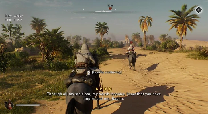Прежде всего, следуйте за Рошан, пока она приведет вас к местонахождению Аль-Гула. Затем садитесь на лошадь и продолжайте следовать за ним.