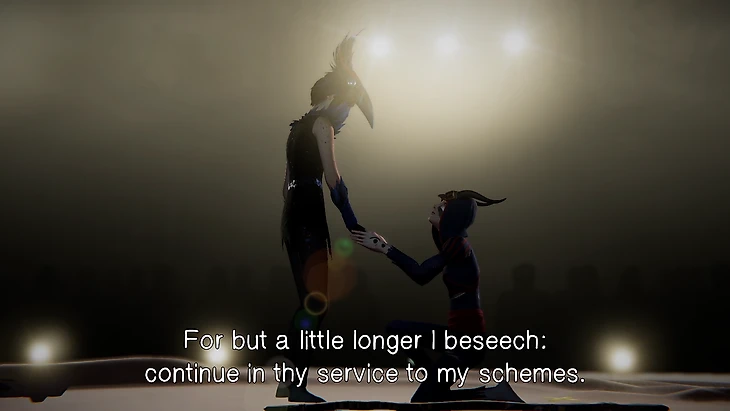Правда, тут случается небольшая неувязка. В игре показывается отрывок из 1 сцены 1 акта, а образ гарпии в оригинальном произведении впервые появляется во время мистерии в 3 сцене 3-го акта. Однако это вовсе не случайность и отнюдь не оплошность со стороны разработчиков! Напротив, это невероятная работа с материалом! Дело в том, что костюм гарпии появляется во время «мистерии» – эдакого спектакля внутри сюжета. Ариэль разыгрывает представление перед королем Неаполя. То есть получается рекурсивная структура! Представление внутри пьесы! А теперь вспоминаем и сравниваем с игрой. Костюм гарпии как раз впервые появляется во время школьной постановки внутри игры. Таким образом в игре сохраняется рекурсивная структура! На взгляд автора статьи, это просто прелестная работа с деталями первоисточника!