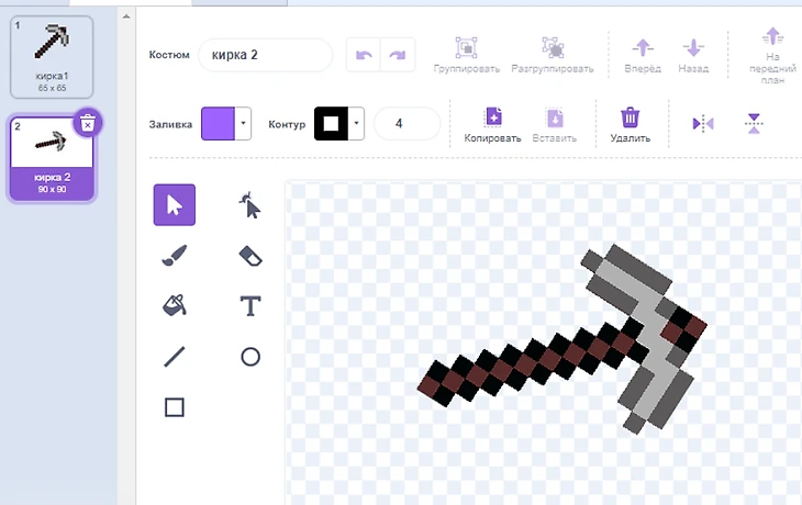 Теперь нам нужно создать новый костюм для кирки, с помощью которого она будет разбивать камни и возвращаться в начальное состояние.