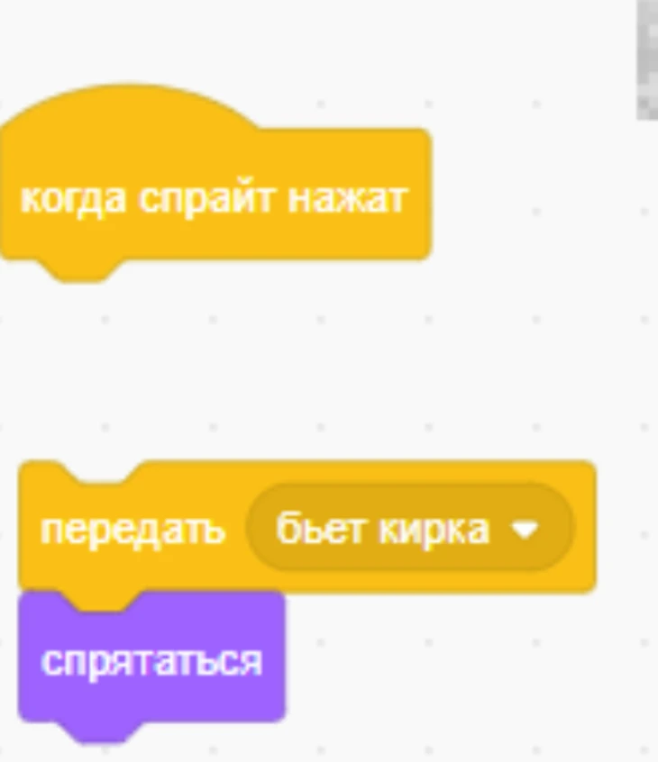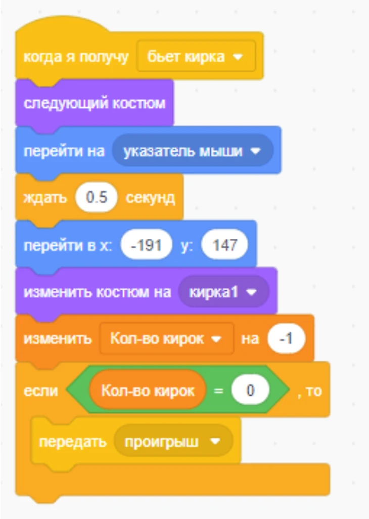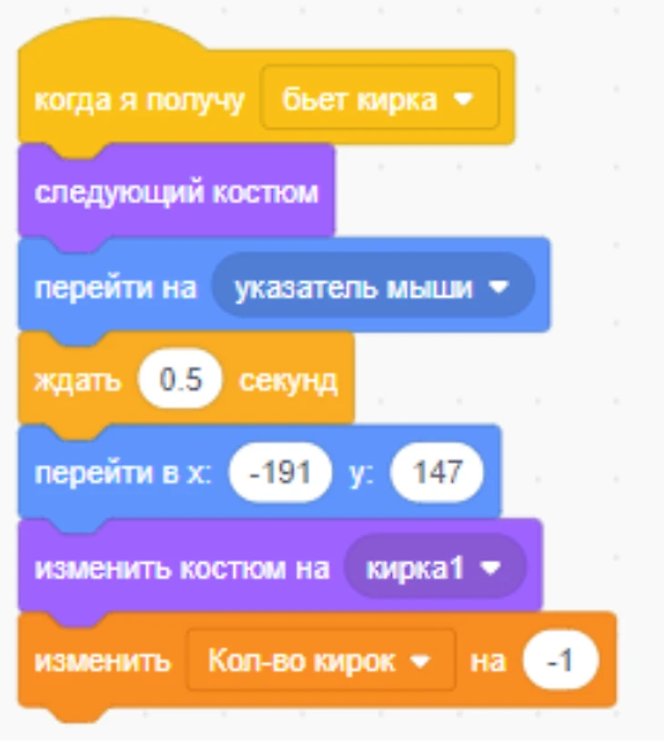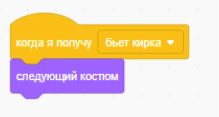 Далее нам нужно получить сообщение «когда я получу — бьет кирка». Это сообщение нужно будет передать, когда кирка будет разбивать блоки.