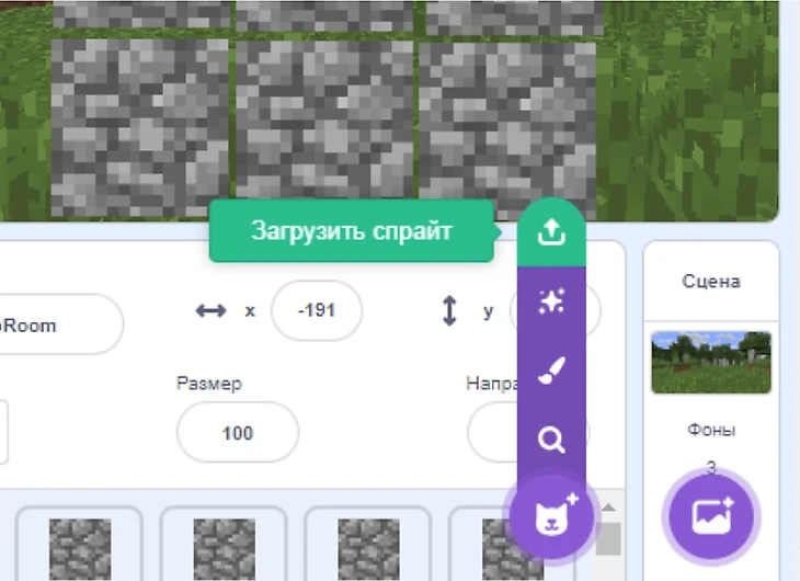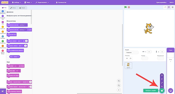 Чтобы загрузить спрайт в Scratch, нужно нажать на кнопку «Выбрать спрайт» — «Загрузить спрайт». После этого вы выбираете папку, в которой у вас находятся все спрайты и загружаете их.