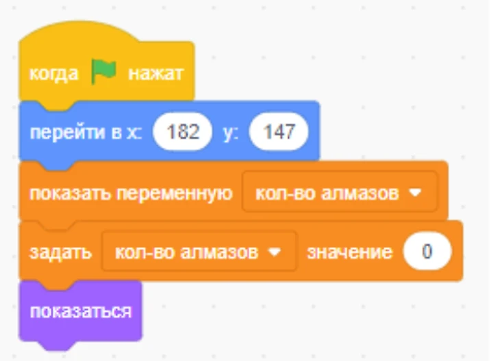 Нам нужно задать расположение алмаза, показать переменную, задать количество алмазов равное нулю и в конце показать сам алмаз.
