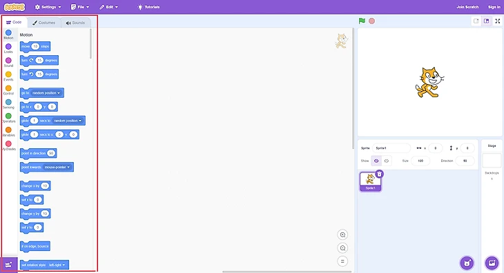 Слева у нас расположены программные блоки, которые разделены по цветам в зависимости от их функции. Как мы можем видеть, у нас есть несколько доступных функций: «Движение», «Внешний вид», «Звук», «События», «Управление», «Сенсоры», «Операторы», «Переменные» и «Другие блоки».