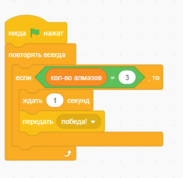 По правилам нашей игры, как только мы соберем 3 алмаза, то мы победим. Поэтому в этом месте мы и будем передавать сообщение «победа!».