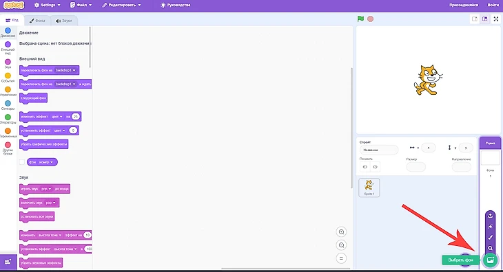 Чтобы добавить фон в Скретч, нужно нажать на «Выбрать фон» – «Загрузить фон».