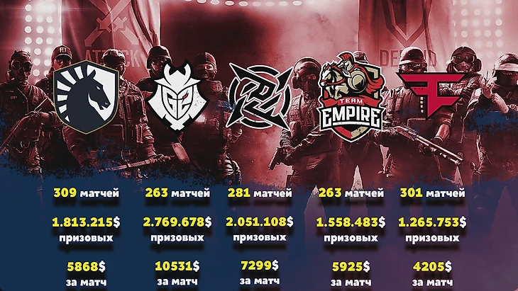 Ну а первой игрой в пятерке у нас оказалось Rainbow Six Siege. Неожиданно выстреливший шутер от Ubisoft, вместе с достаточно большой фанатской базой самой игры, получил и киберспорт, и с 2016 года в ей успели разыграть порядка 41 миллиона долларов. Сама игра, равно как и киберспорт в ней, сейчас испытывает достаточно много проблем. Люди немного устают от нее, разработчики уже не удовлетворяют игроков. Многие большие организации решили уйти из дисциплины и закрыли составы. Но пока киберспорт в дисциплине еще живет, так что записывать ее в мертвецы еще точно рано. В нашу пятерку команд вошли Liquid, G2, Nip, Empire и FaZe.