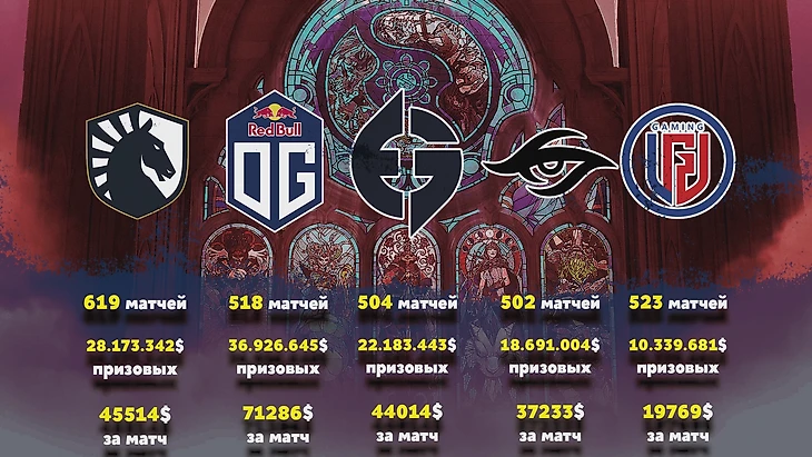 Количество матчей у нас, что и ожидаемо, достаточно большое. Около 533 матчей у каждого коллектива. Больше только в КС. Но и призовые, конечно, огромные. Никто не получил меньше 10 миллионов, а самый большой лидер в лице двукратных чемпионов OG получил и целых 37 миллионов. И таким образом, если посчитать результаты конкретно этих команд, то им для заработка миллиона с призовых понадобилось бы сыграть всего 23 матча.