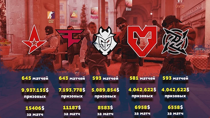 Заходим в тройку сильнейших, и тут одно из удивлений нашего рейтинга, ибо здесь у нас Counter Strike. В основном, конечно, считался именно Counter-Strike: Global Offensive, но и немного статистики нового Counter-Strike 2 у нас здесь также найдется. Конечно, КС игра почти такая же старая, как и киберспорт в целом. Она не была первой, но она была одной из игр, на которых киберспорт вырос как явление. И легендарность игры, как и ее значимость для киберспорта невозможно недооценить. И тут у нас для нашего анализа встречается несколько преград. И самая главная это банально его возраст и тот факт, что почти все команды имеют огромную историю матчей. Но благо учитываются на сайте далеко не все самые старые встречи команд. В итоге в пятерку наших команд попали коллективы Astralis, Faze, G2, Mouz и NIP.