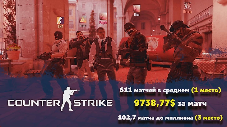 И все они в период подсчета сыграли 611 матчей в среднем. И в среднем на команду заработали по 6 миллионов. Что уже намного больше, чем у всех предыдущих команд из других дисциплин. Но и матчей больше, так что все могло уравняться. По итогу в среднем за один матч все эти команды зарабатывали 9.738 долларов. Почти десять тысяч. Ну а это значит, что для достижения того самого заветного миллиона, командам надо было сыграть 102 матча. Очень и очень неплохо.