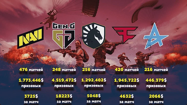 Из-за своего уникального формата, кажется, что число матчей в королевской битве может сильно отличаться, но в среднем у команд из списка было по 323 матча. Что также является и средним числом среди всех команд в рейтинге. Так что там играют так же, как и везде. Но что с заработками? Каждая из команд заработала разное число призовых за всю свою жизнь, но в среднем они зарабатывали по 6.739 долларов за один матч. Что вполне себе неплохо. Можно сказать, что миллион они заработают за где-то 148 матчей. Не самый лучший результат, но и не самый плохой. Прямо идеальное описание и всего киберспорта в ПУБГ в целом.