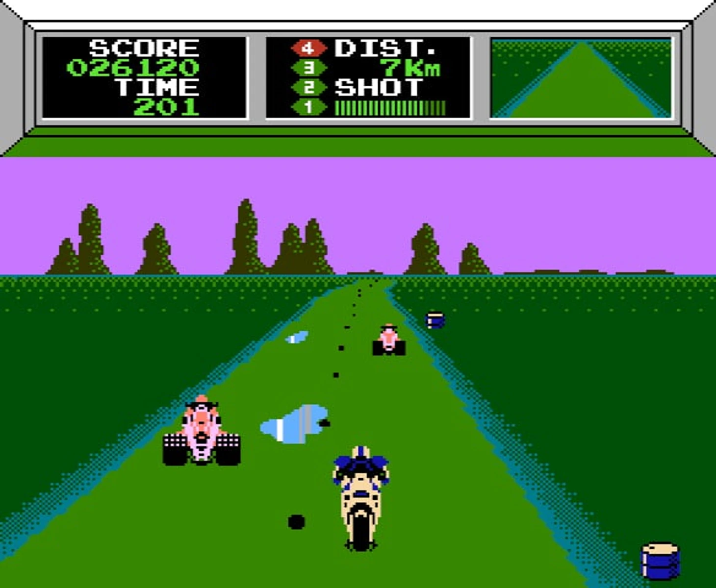 Fighting Course – гонка без времени, но с ограниченным количеством жизней. Казалось бы, можно следовать поговорке «Тише едешь – дальше будешь», но нет. Тут такое не прокатит, так как в этом случае вас обязательно догонит и затаранит какой-нибудь враг. Так что придется мастерски лавировать на грани минимально необходимой и максимальной безопасной скорости. Вам предстоит пройти 20 секторов, в каждом из которых можно выбрать одну из двух трасс (нажатием кнопки А или В). После того как вы пройдете все, они начнут повторяться. Так что у игры, в общем-то, нет конца, и пройти ее полностью не представляется возможным 🤷🏻♂️