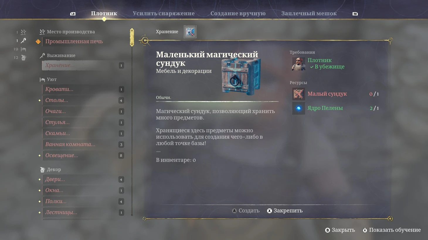 Персонаж построит магический сундук. Закиньте туда ресурсы, и они будут доступны на всей территории лагеря.