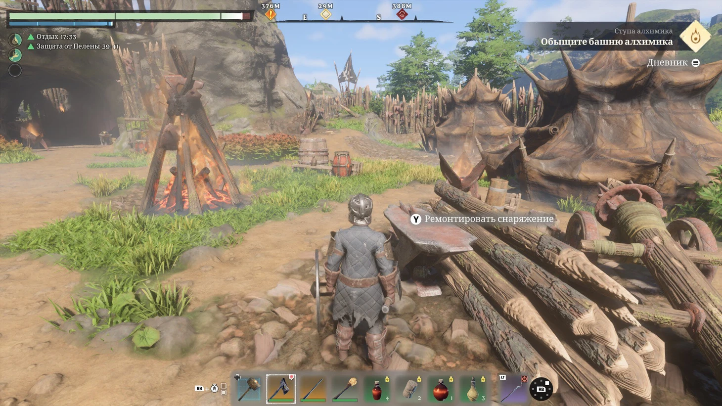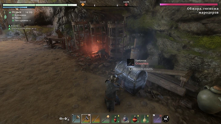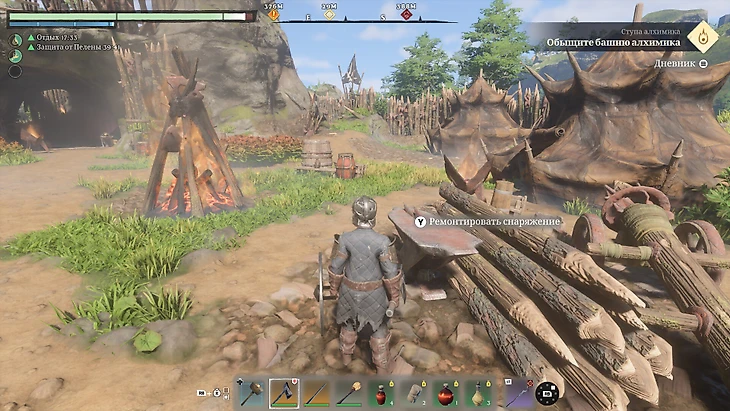 Кирки, топоры и мечи со временем приходят в негодность. Чтобы восстановить вещи, необязательно возвращаться к верстаку на базе. Достаточно забежать в крупный вражеский лагерь – обычно там есть инструменты для ремонта.