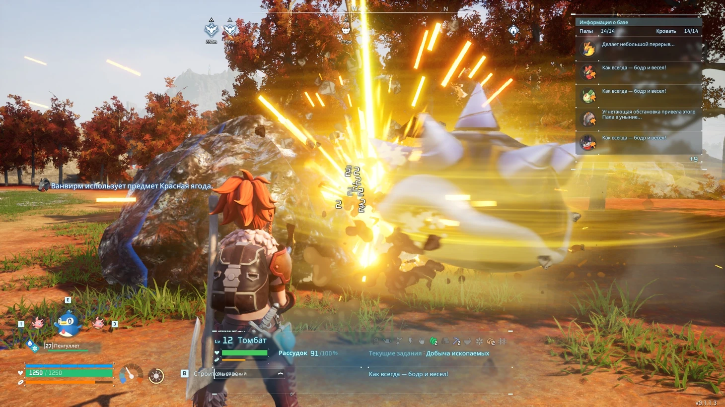 Ферма полуавтоматическая: палы добудут и соберут руду, но положить ее в печь для переработки придется самостоятельно. Для менеджмента ресурсов между базами поможет пассивный навык Каттивы (+50 кг веса за каждого в команде). Защита базы не нужна – поверженные палы воскресают в контейнере.