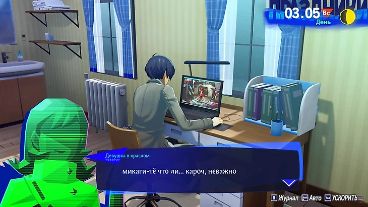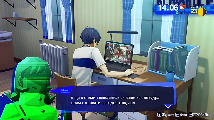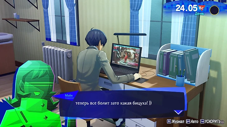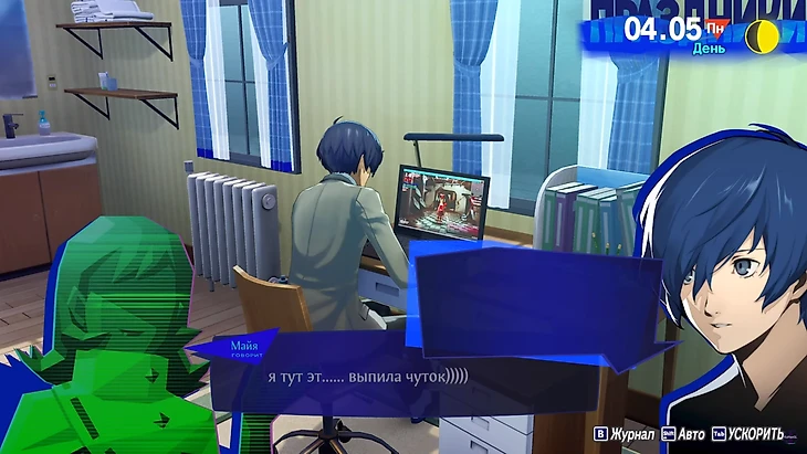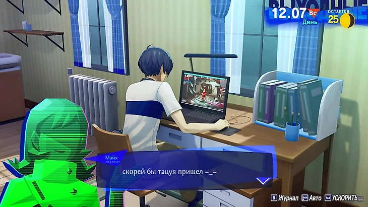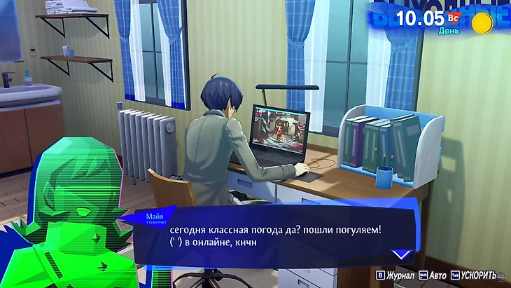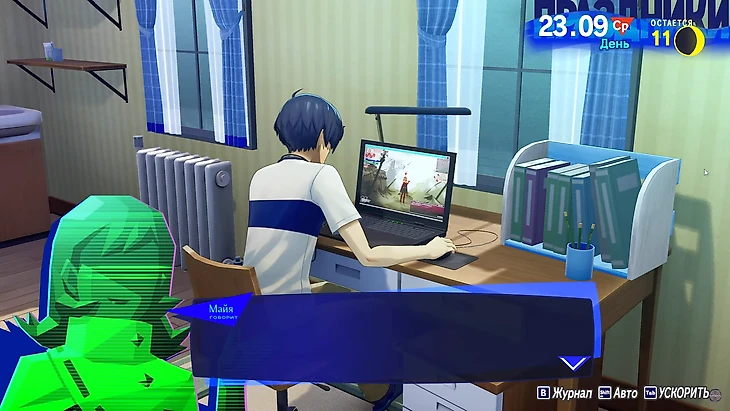 В ранних частях истории в общежитии нет интернета. Как только он появится, вы сможете получить доступ к своему компьютеру и Джунпей подарит вам копию ММО. Загрузите, а затем запустите игру на компьютер, чтобы начать социальную связь с Майей.