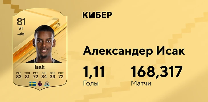 Наверное, вы ждали здесь кого-то вроде Дарвина Нуньеса. Форвард «Ливерпуля» классно выступает в реальной жизни и получил сильную эволюцию карточки, но все равно недотянул – 0,97 гола за игру. Вместо него Александер Исак из «Ньюкасла». Среднюю карточку едва спасает «Охотник», но на статистику сильно повлияла идеальная слабая нога футболиста.
