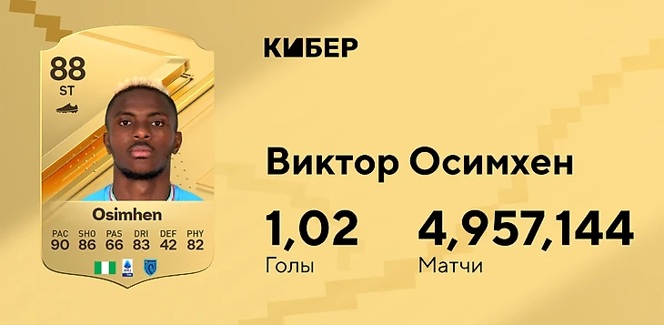 Рядом с Чиро расположился Виктор Осимхен. Карточка нигерийского супербомбардира – одна из лучших в игре, у нее полный порядок со спринтерскими рывками, ударами и прыжками. Для места выше форварду «Наполи» не хватило дриблинга.