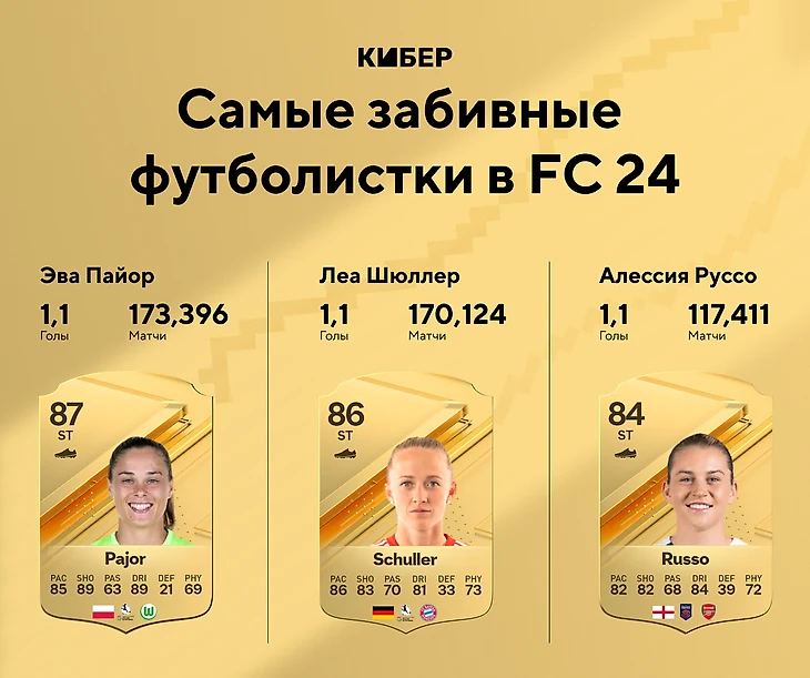 Нападающие-женщины довольно часто встречаются в составах. Игрокам полюбились карточки Каролины Хансен, Кадидиату Диани и Асисат Ошоалы, но их статистика просела. Топ-3 самых эффективных бомбардиров среди девушек поделили Эва Пайор из «Вольфсбурга», Леа Шюллер из «Баварии» и Алессия Руссо из «Арсенала» с результатом 1,1 гола за игру.