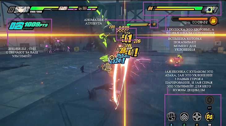 Слева вверху команда из трех героев. Справа – шкала здоровья врага, а под ней оранжевая шкала оглушения. Под командой находится счетчик децибелов, благодаря которым можно использовать ульту. А снизу справа расположены кнопки атаки – обычная атака, уклонение, навык и парирование. Над ними расположена кнопка ультимейта, но его можно использовать только при наличии нужного количества децибелов.