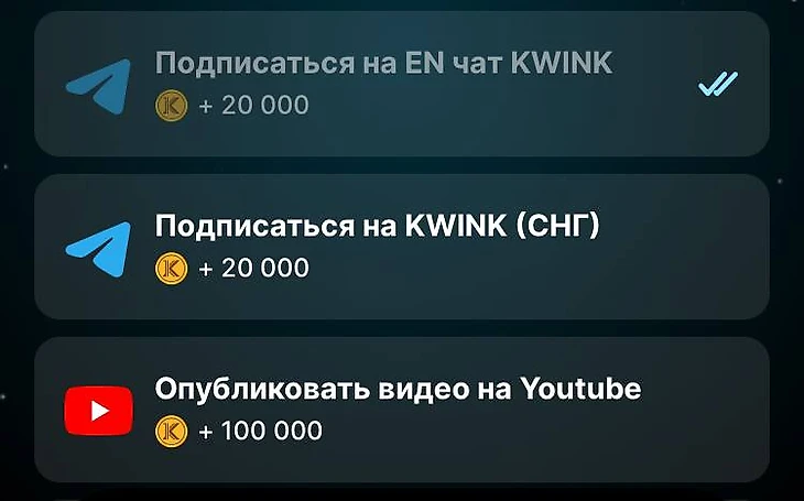 В разделе «Задания» в Kwink есть небольшой список квестов, за выполнение которых можно получить солидное вознаграждение. По 20 тысяч монет можно получить за выполнение заданий (всего их 4), связанных с подпиской на Телеграм-каналы или чаты проекта. Проверка осуществляется сразу, а после получения монет можно сразу же отписываться от них.