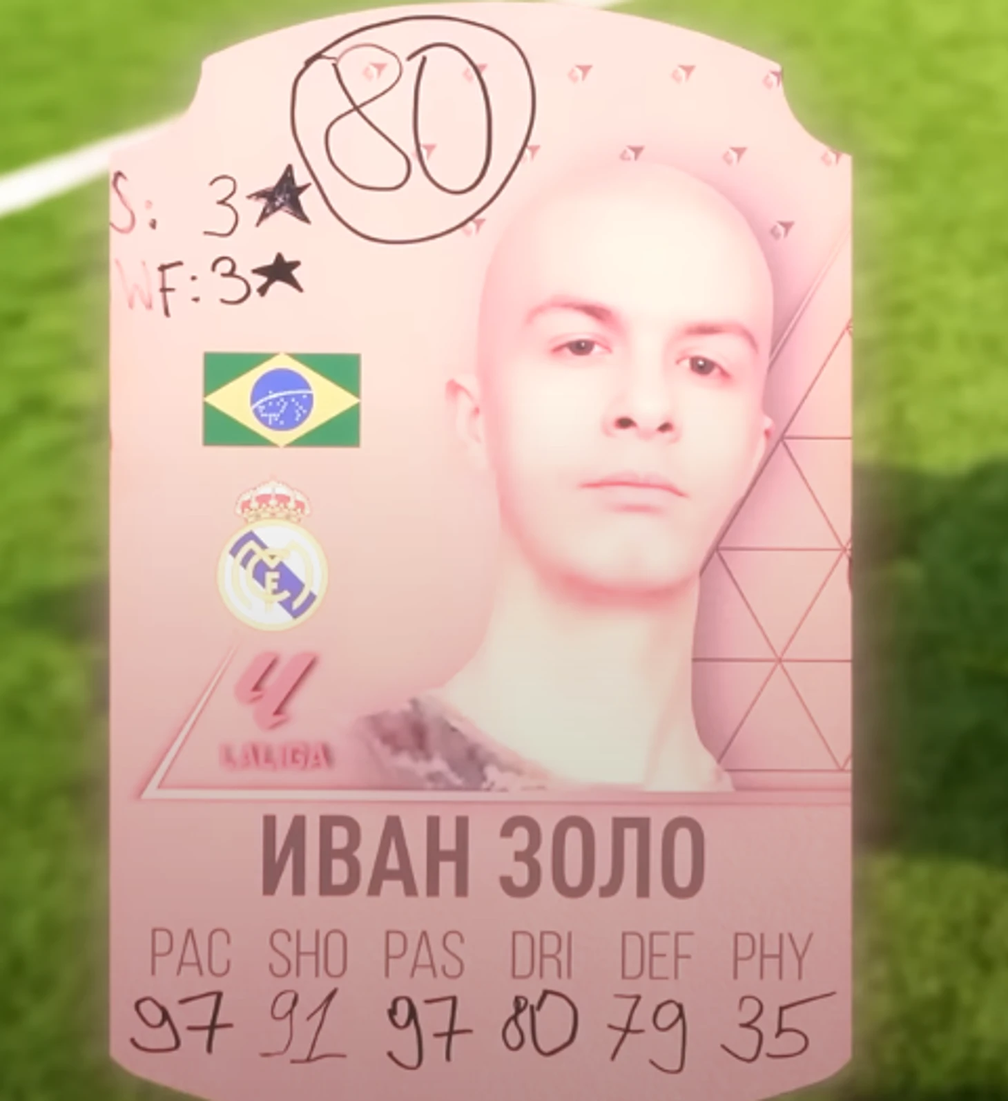 Буду честен, было еще несколько испытаний на точность и реакцию, где Иван Золо показал великие способности, пытался набить мяч, обводить фишки и демонстрировать навыки обороны. В конце видео команда оценила статы Ивана – и получилась такая карточка.