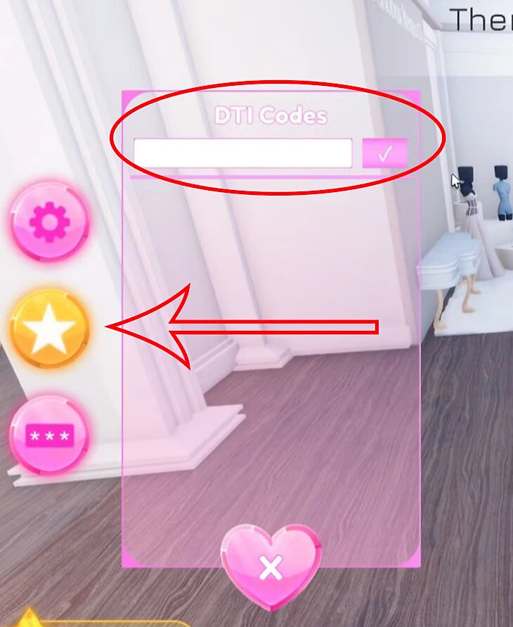 В левой части экрана находится большая кнопка в виде звезды. Нажмите на нее и введите код в поле с надписью DTI Codes, а потом нажмите на ✅ подтверждение.