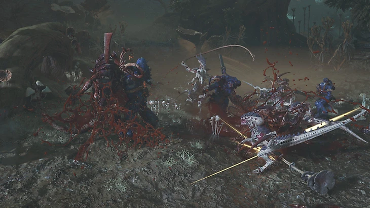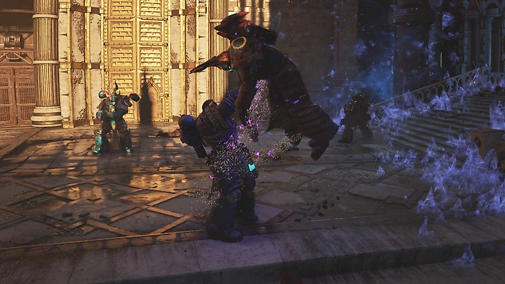 В Space Marine 2 есть механика добивания в духе DOOM. Если нанесли достаточно урона, цель засветится красным. В этот момент космодесантник может зрелищно порвать врага. Прием восстанавливает броню, поэтому в тяжелой битве высматривайте хилых тварей, стреляйте по ним и сразу же добивайте – это спасет жизнь.