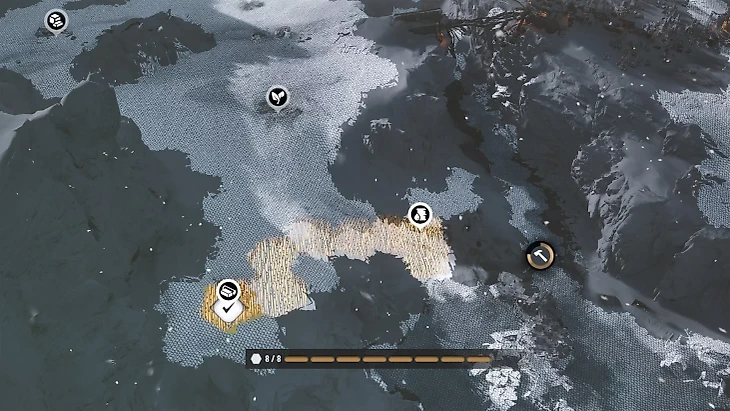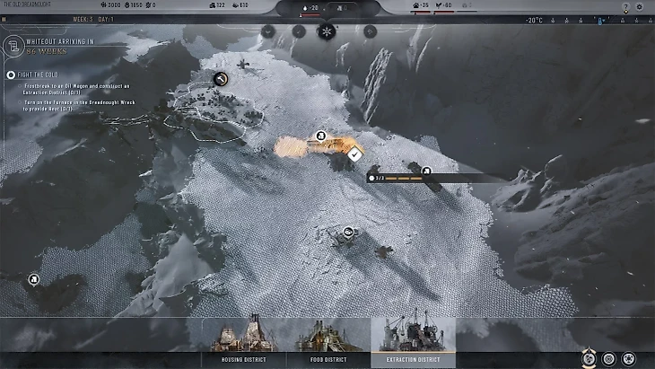 Начните игру в Frostpunk 2 с активации круга «Морозолом» в правом нижнем углу экрана. Это действие подсветит несколько участков рядом с Обломками Дредноута и покажет, где на карте находятся ресурсы. Затем выберите подсвеченный участок возле Нефтяной Цистерны (она обозначена значком бочки с нефтью). Это расширит область подсветки в сторону Цистерны.