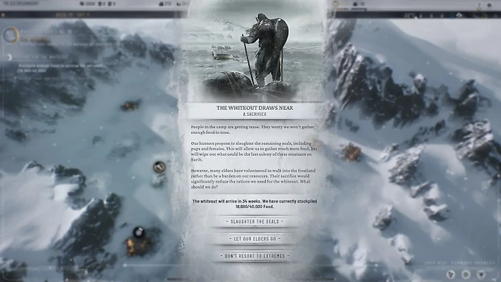 Принятие трудного решения. Примерно на 65-й неделе игры наступит событие «Приближение Белой мглы». В этот момент придется сделать непростой выбор: либо пожертвовать тюленями для пропитания, либо отпустить старейшин общины.