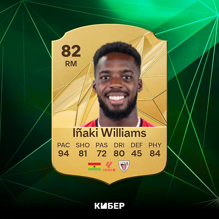 Быстроногий Иньяки Уильямс давно радует фиферов. В этом году ганца хорошенько усилили: дали завершение 82 и долгожданные три звезды на слабой ноге. Универсальная карта с «Бомбардиром» подойдет для фланга или центра атаки.