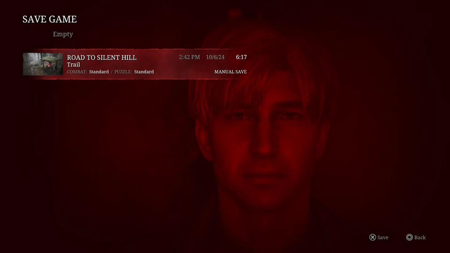 Для активации сохранения необходимо взаимодействовать с красным квадратом, нажимая кнопку X на PS5, A на Xbox Series X|S или E на ПК. После этого игрок попадает на экран сохранения, где доступно создание до 10 отдельных слотов. Каждый слот содержит подробную информацию о реальном времени сохранения, времени, проведенном в игре, и текущей главе. В оригинальной версии Silent Hill 2 для PS2 существовал скрытый режим, позволяющий сохраняться в любом месте. Для его активации требовалось выполнить определенную комбинацию клавиш на геймпаде. Однако в последующих переизданиях, включая версию от Bloober Team, эта функция была удалена.