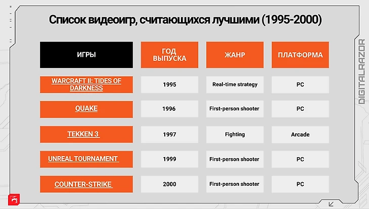 В период с 1995-го по 2000-й ежегодно выходили игры, которые сегодня олицетворяют собой какую-либо из киберспортивных дисциплин. Они стали неотъемлемой частью индустрии. Именно в те годы CS, Quake, Doom, Unreal Tournament и WarCraft укрепили концепцию соревнований друг против друга: как в команде, так и в одиночку.